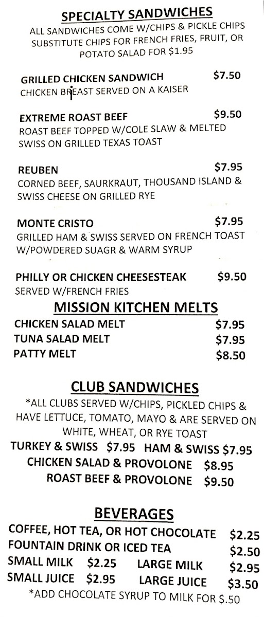 For those seeking lighter options, the Mission Kitchen Salads are ideal, featuring fresh choices such as Caesar, Chef, and Greek salads, along with Chicken or Tuna Platters. If you’re in the mood for something indulgent, the Club Sandwiches like Turkey & Swiss and Ham & Swiss are classic picks, with the Chicken Salad & Provolone and Roast Beef & Provolone providing tasty alternatives.