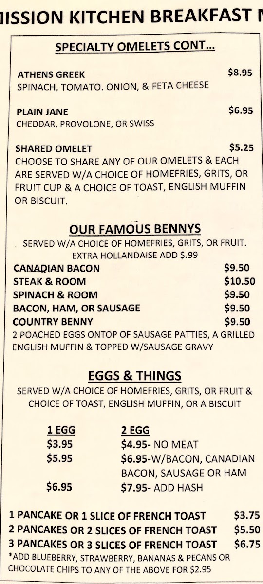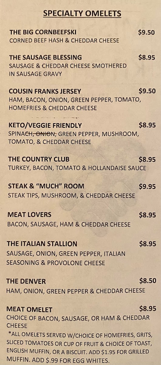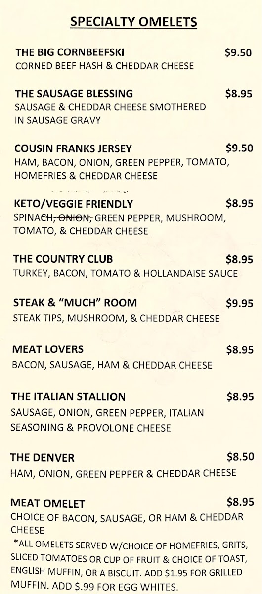 Breakfast enthusiasts will be delighted with the Specialty Omelets, which include options like The Big Cornbeefski, The Sausage Blessing, and the Keto/Veggie Friendly Cousin Franks Jersey. For a more traditional breakfast, the Famous Bennys are a must-try, with choices such as Canadian Bacon, Steak & Room, and Spinach & Room. The breakfast menu also offers a variety of egg and bread combos, including the Eggs & Things with Pancakes or French Toast, and Breakfast Sandwiches like Egg & Cheese and Bacon, Sausage, or Ham Egg & Cheese.
